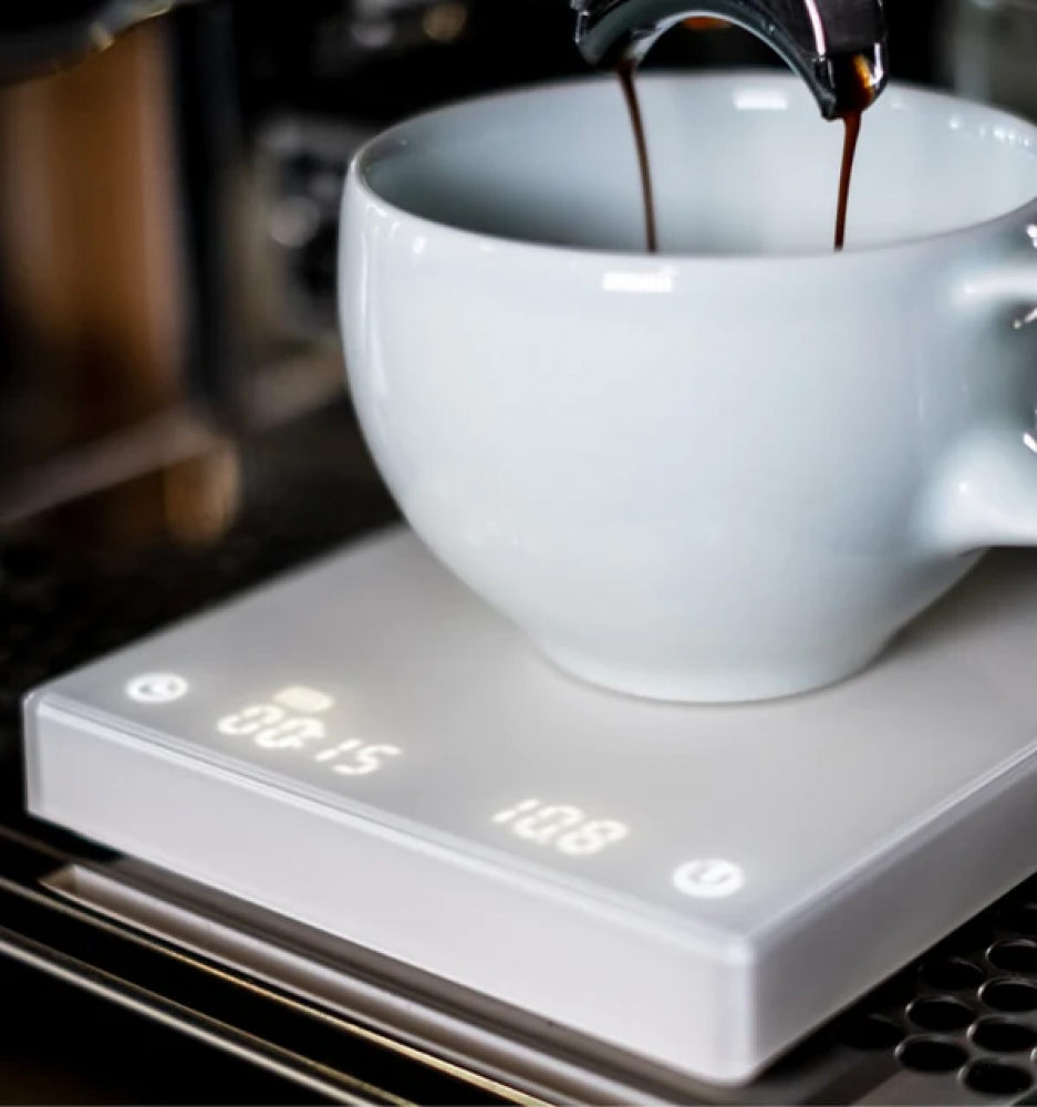 The scale comes with a modern coffee filter design, suitable for home and professional barista use, and allows you to track and control time and weight via a built-in smart screen.